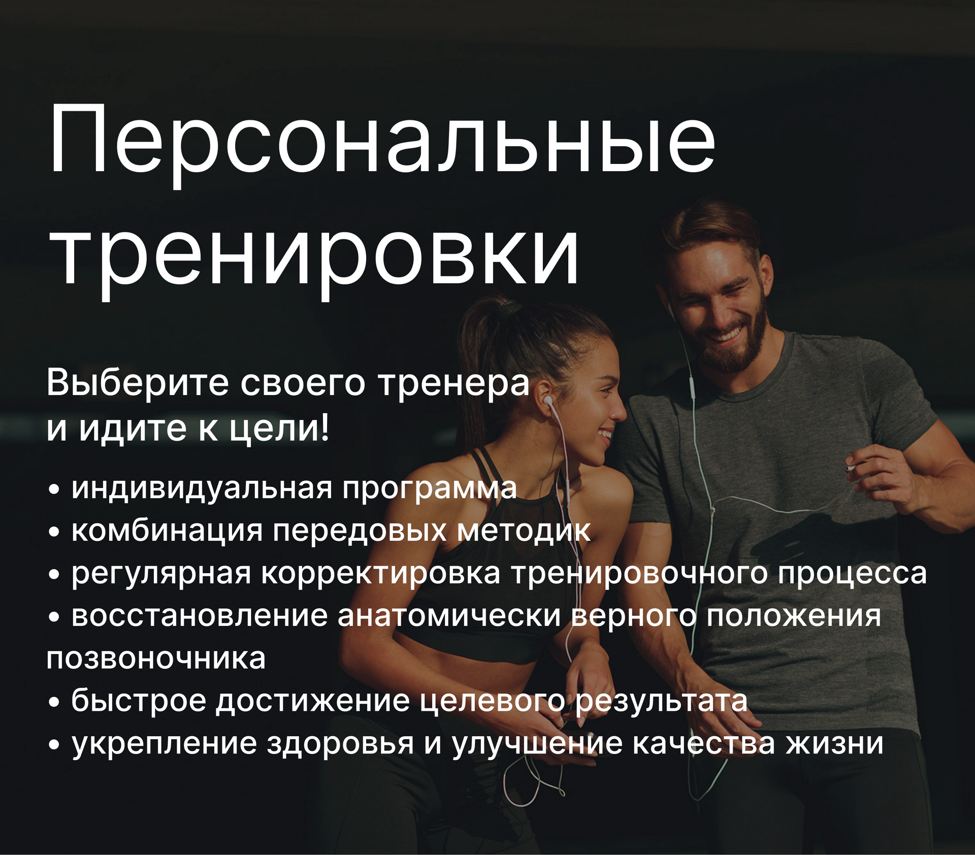 Под чутким руководством наших специалистов, использующих в работе экспертные методики и персональный подход, вы быстро добьетесь тренировочных целей, сможете поддерживать физическую форму и необходимый уровень энергии для отличного самочувствия.